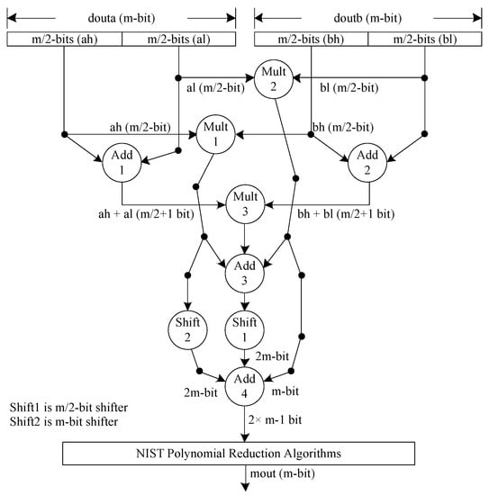 Instead of the polynomial split levels for the Karatsuba multiplier, the complete multiplication architecture is shown in Figure 5, where each polynomial is split into two parts, each of size , resulting in four sub-polynomials, indicated as ‘ah’, ‘al’, ‘bh’, and ‘bl’. The ‘ah’ and ‘al’ are the split polynomials incoming from the douta port of the DP-BRAM memory. Similarly, ‘bh’ and ‘bl’ are the split polynomials incoming from the doutb port of the instantiated memory. Moreover, Figure 5 shows the three inner multiplications required to operate the Karatsuba steps. These include Mult1, Mult2, and Mult3. Mult1 multiplies ‘ah’ and ‘bh’, Mult2 multiplies ‘al’ and ‘bl’, and Mult3 multiplies the outputs generated by adders (i.e., Add1 and Add2). Despite three inner multiplications, four addition operations are also needed to execute Karatsuba multiplication; these include Add1, Add2, Add3, and Add4. Add1 produces a sum of ‘ah’ and ‘al’. Similarly, Add2 adds ‘bh’ and ‘bl’. Add3 produces a sum of the multiplication results generated by multipliers Mult1, Mult2, and Mult3 (as shown in Figure 5). Add4 produces a -bit output. In addition to addition and multiplication operations, two shift operations are also needed, named Shift1 and Shift2. The corresponding Shift1 and Shift2 operators shift the polynomials by and m bits toward the right, respectively, where m is 233.