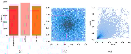 Figure 3a displays the objects’ names and corresponding amounts on the horizontal and vertical axes, respectively, indicating that the dataset encompasses an adequate number of instances for each defect type, with the three defect categories exhibiting balance in terms of quantity. Figure 3b illustrates the distribution of the object’s position in the image. The horizontal and vertical coordinates correspond to the ratio of the label center coordinates to the width and height of the image. The distribution of objects is observed throughout most locations within the images. The size of objects was shown in Figure 3c, and it can be seen that there are more small- and medium-sized objects in the dataset.