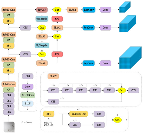 It can be divided into the backbone and the head. The function of the backbone network is to extract features. The original backbone of YOLOv7 is composed of several CBS, MP, and ELAN modules. The CBS is a module consisting of convolution kernel, batch normalization, and SiLU activation function. The MP is consisting of MaxPooling and CBS. The improved backbone replaced the ELAN module with the MobileOne module to increase speed, and a coordinate attention module was added after each MobileOne module. The proposed improvement method has the capability to attend to salient features and suppress extraneous information in the input image, thereby improving detection accuracy effectively.