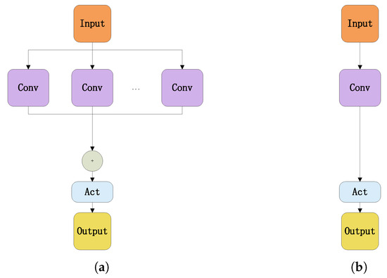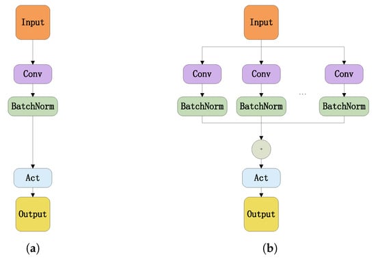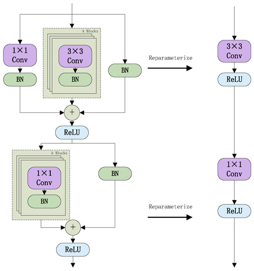 The regular convolution module is composed of convolution kernel, batch normalization, and activation function. In contrast, several identical parallel branches were contained by over-parameterized convolution and the outputs of all branches are summed before entering the activation function. The addition of branching structures can enhance the representational capacity of the model. By increasing the complexity during training, the performance of the model has been improved.