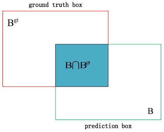 The IoU refers to the ratio of the intersection area and union area of the predicted box and the ground truth box, as shown in Figure 9. Equations (10) and (11) are the equations for IoU and the IoU loss