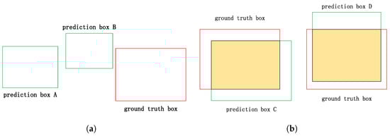 where B is the predicted box and is the ground truth box. The value of is positively correlated with the degree of overlap between the predicted box and the ground truth box. The IoU is widely applied in object detection algorithms. Nevertheless, there are two issues with IoU, as shown in Figure 10. Figure 10a shows one scenario. Two predicted boxes, A and B, have no intersection with the ground truth box. According to Equation (11), their losses are both 1. However, predicted box B is closer to the ground truth box than predicted box A; therefore, the loss of predicted box B should be smaller. Figure 10b shows the other scenario. Predicted boxes C and D differ in their spatial relationships with the ground truth box. Yet, the loss remains the same for both. It is difficult to determine which predicted box is more accurate in this situation. These existing problems lead to less efficient convergence of IoU.
