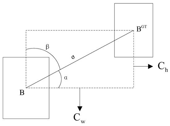In the early stage of training an object detection network, the situation that the predicted box and the ground truth box do not intersect often happens. Therefore, how to quickly converge the distance between the predicted box and the ground truth is a question worthy of consideration. The SIoU first determines which direction is closer between the predicted box and the ground truth box in X-axis and Y-axis. Then, it moves towards the ground truth box in the closer direction. Figure 11 shows the boundary regression of SIoU, where is the angle between the line connecting the center points of the two boxes and the x-axis, is the angle with the y-axis, is the height difference between the center point of the ground truth box and the predicted box, and is the distance between the center point of the real box and the predicted box.