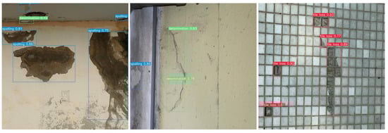 Representative scenes involving the three defect types were selected as shown in Figure 12. The BFD-YOLO based on MobileOne, CA, and SIoU was used to exhibit the detection effect. The three-colored inspection boxes represent delamination, spalling, and tile loss, respectively. The confidence level of the detection box is indicated by the number above the box, which represents whether the model can effectively detect defects of the façade. Table 3 presents the detection performance for each type of defect and the average detection performance.