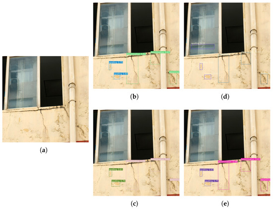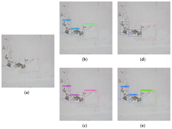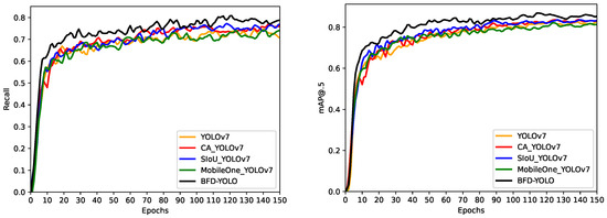 Five sets of ablation experiments, including YOLOv7, coordinate attention-based YOLOv7 (CA-YOLOv7), SIoU-based YOLOv7 (SIoU-YOLOv7), MobileOne-based YOLOv7 (MobileOne-YOLOv7), and our proposed method for building façade defects detection (BFD-YOLO), were performed to verify the effectiveness of the improvements proposed in this paper. The recall and mAP@.5 curves of models employing different improvements are depicted in Figure 13. It can be seen from Figure 13 that the MobileOne module effectively enhances the accuracy of the model, while the CA and SIoU modules improve the recall.