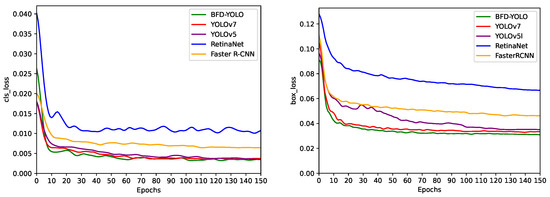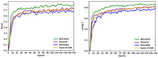 Ablation experiments demonstrate the effectiveness of the proposed improvements in this paper, while further comparative evaluations are required to determine whether our method has reached a competitive performance level. Experiments were conducted on YOLOv5 [40], RetinaNet [41], and Faster R-CNN [21] using the dataset proposed in this paper and were compared with the BFD-YOLO. The official default configuration was used for the training of YOLOv5, RetinaNet, and Faster R-CNN. Specifically, the YOLOv5l model was selected, momentum was set to 0.937, weight decay rate was set to 0.0005, and the number of warm-up epochs was set to three during training of YOLOv5. Resnet50 was chosen as the backbone network, momentum was set to 0.9, and weight decay rate was set to 0.0005 by both RetinaNet and Faster R-CNN. SGD was adopted for the training of the three models. Different models’ training results are shown in Figure 14. It can be observed from Figure 14 that our method achieves higher recall and mAP@.5 than the other methods.