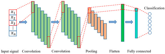 With the continuous development of neural networks, deep neural networks have not only achieved great success in imaging but have also started to be used in structured data processing. In this paper, three types of deep neural networks, namely CNN, LSTM, and DAE, are used for damage identification of bridge structure monitoring data. In the structure of a CNN, the first few layers are usually alternating between convolutional and pooling layers, while the last layers near the output consist of fully connected layers responsible for mapping the features extracted by the former to the corresponding damage classes [27]. The structure of a CNN is shown in Figure 2.
