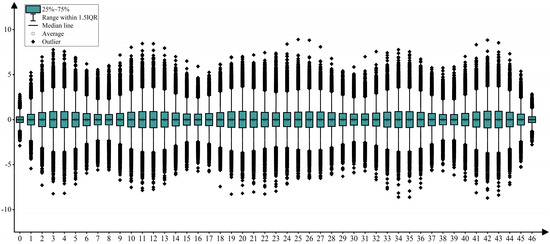 The dataset used in this study is derived from the public dataset for structural health monitoring provided by the European Workshop, which is available at http://users.metropolia.fi/~kullj/ (accessed on 12 March 2023), and a detailed description of the dataset is provided in reference [28]. The data is derived from a sequence of y-direction accelerations measured by 47 sensors, each with a certain deviation of Gaussian noise added to reflect the interference from the external environment of the bridge, with an average noise level of approximately 10% of the signal for each measurement of 2859 samples, a data size of , and a sampling frequency of 571 Hz. The first 50 measurements are taken from undamaged structures, and the last 50 measurements are taken for five types of damage: Damage 1, Damage 2, Damage 3, Damage 4, and Damage 5, with data measured from different damaged structures.