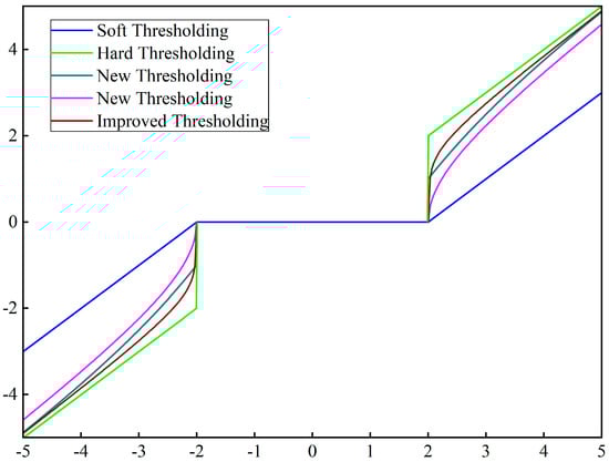 After parameter adjustment, the optimal regulatory factors , , and the image of the threshold function are shown in Figure 4. The improved threshold function rapidly brings the function closer to the hard threshold function while eliminating the discontinuity at the threshold.