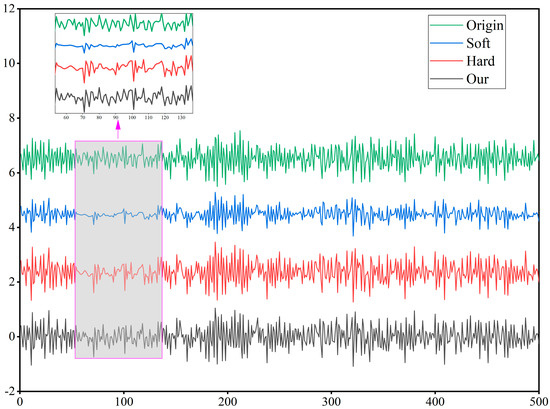 Taking the first 500 data points from the first sensor as an example, Figure 5 shows a comparison of the noise reduction effect with different threshold functions. It can be seen that our method overcomes the amplitude loss problem of the soft and hard threshold functions while removing the maximum amount of noise. After experimental validation, the results of the noise reduction evaluation are shown in Table 2. The SNR and MSE obtained by our method are significantly better than the other two methods.