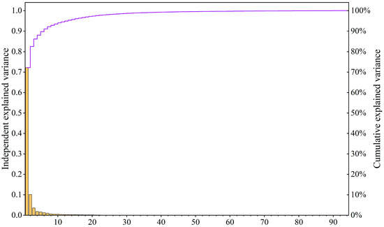 Since each data point in the frequency statistics dataset has 94 feature dimensions, overfitting tends to occur when training the model on data with too much dimensionality, so there is a need to reduce the dimensionality of the data while retaining as much feature information as possible. In this paper, we propose to use PCA for feature selection and dimensionality reduction, and the contribution of the principal components of each feature is shown in Figure 7.