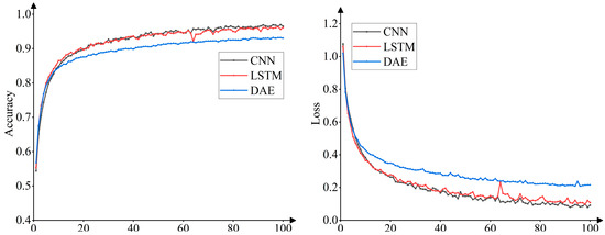 A total of 100 epochs are iteratively trained in this experiment, and Figure 8 shows the changes in accuracy and loss values during the training process. In Figure 8, with the increasing number of training iterations, the training curves of all three types of deep neural networks gradually reach convergence, and the final training accuracies of the CNN, LSTM, and DAE are 96.49%, 96.1%, and 93.03%.