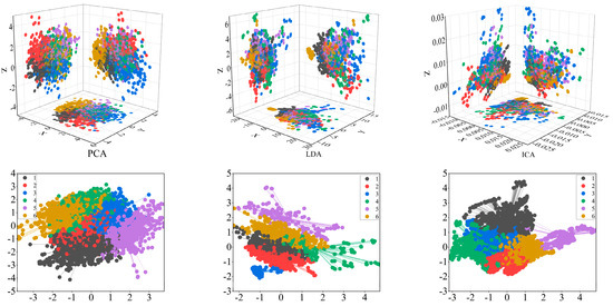 This paper also validates the effectiveness of PCA by investigating the impact of correlation and damage identification on data classification using two methods, linear discriminant analysis (LDA) and independent component analysis (ICA), respectively. Figure 9 shows the correlation distribution of data categories after processing using these three methods. Compared to these two methods, PCA reduces the dimensionality of the data while maintaining maximum differentiability through variance maximisation, effectively retaining information about the data categories, while the category distribution is generally consistent with the results obtained using the k-means clustering algorithm. Finally, using the same model, the damage recognition accuracy of PCA is also higher than the other two methods, and the results are shown in Table 7.