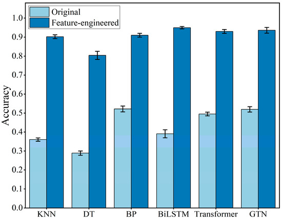 This paper uses other algorithms for comparison on the original dataset and the feature-engineered dataset, respectively, including KNN [31], DT [32], BP [33], BiLSTM [34], Transformer [35], and GTN [36]. For the machine learning algorithms, accuracy improvement is used as the objective function, and its hyperparameters are tuned through the Bayesian optimisation method in the fetch space by continuous iteration. The Transformer and GTN model architectures are both adopted from the original paper, and other relevant settings are used as described in this paper. Figure 10 shows the damage identification results. The recognition accuracy of the various algorithms is greatly improved on the feature-engineered dataset, which validates the effectiveness of our proposed feature engineering.