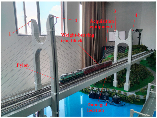 Bridge structure and data acquisition equipment. The installation locations of the four sensors in the bridge are labelled using the numbers 1, 2, 3 and 4.