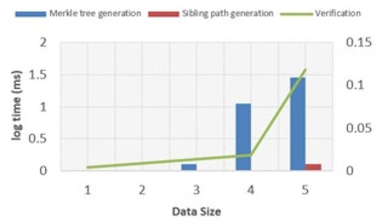 The results in Figure 1 reflect Merkle tree-based approaches for data verification. The evaluation was conducted by measuring the computational time and amount of data for each experiment, with each experiment being repeated 100 times to minimize errors caused by outliers.