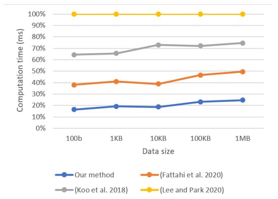 In Figure 3, we also compare the computation time and data size metrics with those of other similar work. Our results show a significant change after a data size of 100 KB, indicating that the study’s outcomes are comparatively reliable. These findings can be applied to improve the efficiency and accuracy of Merkle tree-based approaches for data verification.