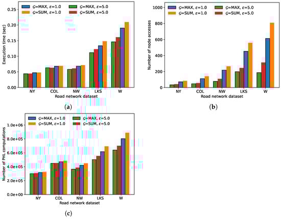 Comparison of FANN search performance for various road network datasets (). (a) Execution time (seconds), (b) number of node accesses, (c) number of distance computations.