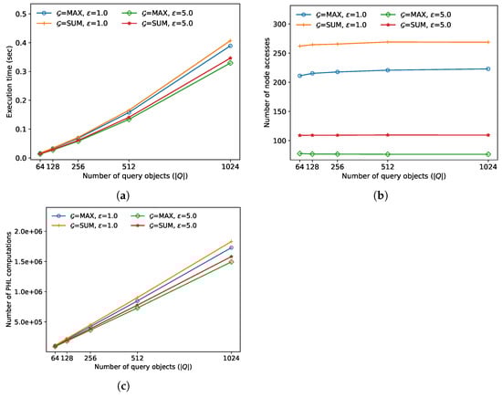 In the second experiment, we compared the FANN search performance for various query sizes M. As demonstrated in Figure 4, the execution time and the number of distance calculations increases almost linearly as M increases for both algorithms. This is because both algorithms need to calculate the exact distances D to M query objects to find both and [12]. Meanwhile, the number of node accesses has not changed much as M increases for both algorithms. This is because, if the regions containing the query objects are similar, both and remain similar even though M increases [12]. In this experiment, the approximate algorithm always outperformed the exact algorithm; the performance improved by up to 18.7% when and sum.