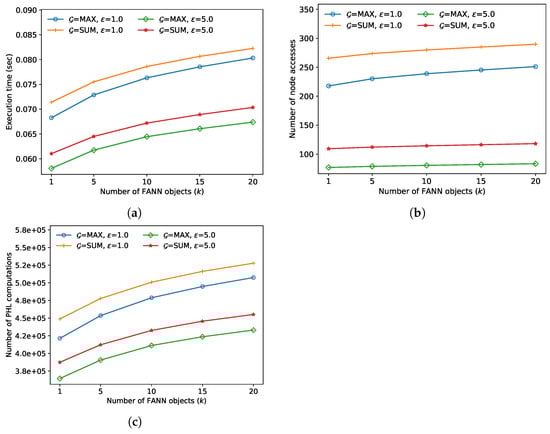 In the third experiment, we compared the FANN search performance for various numbers of nearest neighbors k, and the results are demonstrated in Figure 5. For both algorithms, in lines 7 and 11 of Algorithm 1, the pruning bounds become larger as k increases. Thus, more index nodes are accessed, and more distance calculations to the objects in the index nodes are performed, thereby increasing the execution time of both algorithms. In this experiment, the approximate algorithm always outperformed the exact algorithm; the performance improved by up to 19.2% when and max.