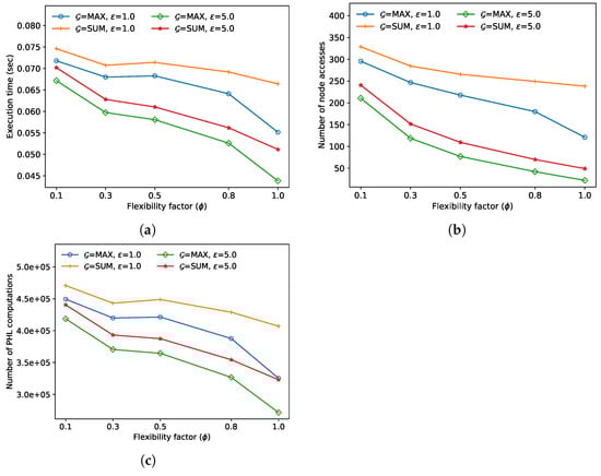 In the fourth experiment, we compared the FANN search performance for various flexibility factors . In Figure 6, as increases, the execution time, the number of node accesses, and the number of distance calculations tend to decrease for both algorithms. This is because, as increases in line 7 of Algorithm 1, increases more rapidly than , and thus the number of entries added in the priority queue H decreases. In this experiment, the approximate algorithm always outperformed the exact algorithm; the performance improved by up to 29.9% when and sum.