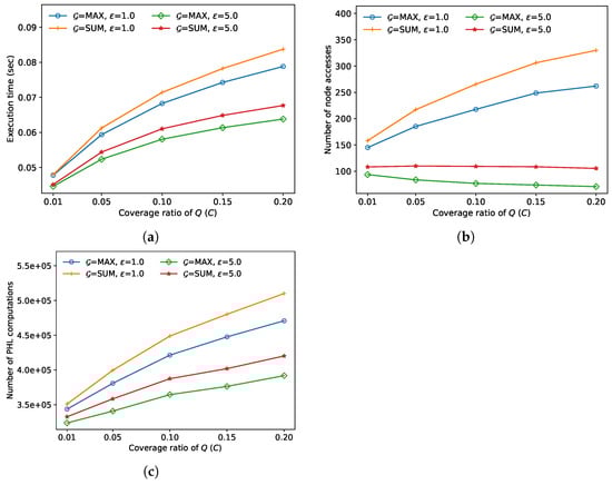 Comparison of FANN search performance for various coverage ratios of query (C). (a) Execution time (seconds), (b) number of node accesses, (c) number of distance computations.