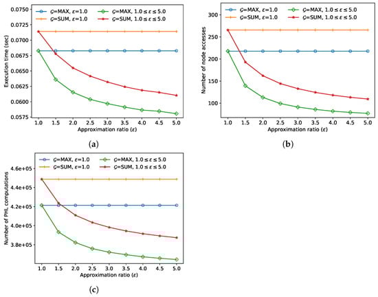 Comparison of FANN search performance for various approximation ratios (). (a) Execution time (seconds), (b) number of node accesses, (c) number of distance computations.