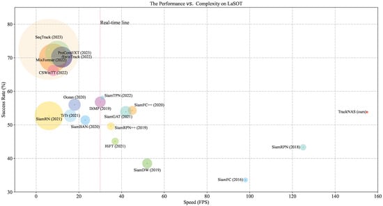 Comparison of the performance and complexity of representative advanced Siamese trackers on the LaSOT dataset. The efficient tracker should locate at the top-right corner. The red vertical dashed line denotes the real-time bound (30 FPS) according to [1]. The circle diameter is in proportion to the computational volume in terms of the FLOPs of the tracker. That is, the smaller the diameter of the circle, the fewer the FLOPs of the tracker. The trackers including SiamFC [5], SiamRPN [6], SeqTrack [13], SiamFC++ [14], SiamRPN++ [15], DiMP [16], SiamBAN [17], SiamGAT [18], Ocean [19], SiamRN [20], SwinTrack [21], MixFormer [22], CSWinTT [23], ProContEXT [24], SiamDW [25], HiFT [26], SiamTPN [27], TrTr [28], and the proposed TrackNAS.