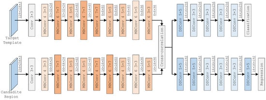 In recent years, convolutional neural networks (CNNs) have been widely used in various computer vision tasks because of their excellent feature extraction and representation ability. As a special CNN architecture, the Siamese network can measure the similarity among inputs well, making it suitable for visual tracking [3]. Thus, visual tracking approaches based on the Siamese network (a.k.a., Siamese trackers) have been developed [4,5,6,7,8]. However, the CNNs used by Siamese trackers are generally directly migrated from other computer vision tasks and are unsuitable for visual tracking [9]. Additionally, these network architectures are designed and trained manually, and their design processes are often influenced by subjective and objective factors: the former is that experts may add designs to the CNN architectures according to their own experience, and the latter is that experts’ knowledge is insufficient, leading to the necessity of multiple tests to determine the best CNN architectures, which requires considerable time and effort [10,11,12]. In addition, although the existing Siamese trackers have made considerable progress with regard to high tracking performance [5,6,13,14,15,16,17,18,19,20,21,22,23,24,25,26,27,28], the network architectures used are becoming increasingly heavy and expensive, resulting in larger numbers of parameters and computation volumes, as shown in Figure 1. For example, the latest Siamese trackers SiamRPN++ [15] and SiamFC++ [14] utilize GFLOPs and GFLOPs as well as million and million parameters (the efficiency of trackers here was evaluated by using AlexNet [29]), respectively, to achieve advanced tracking performance, and the high complexity makes it difficult to deploy these trackers to resource-constrained devices, such as unmanned aerial vehicles, industrial robotics, and driving assistant system [30].