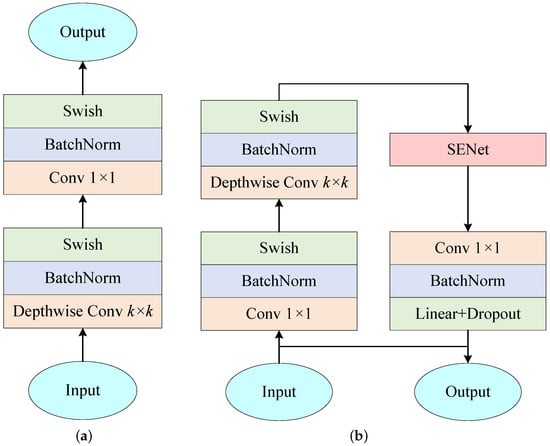 The architectures of DSConv and MBConv cells. “Swish” denotes the Swish activation layer [72]. (a) DSConv cell. (b) MBConv cell.