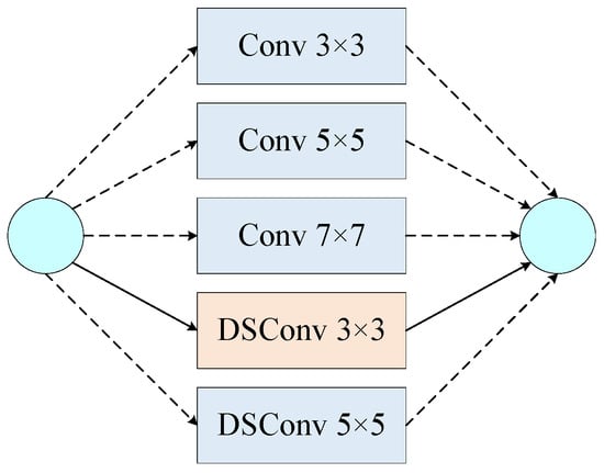 DSConv is derived from MobileNet [36], a lightweight network architecture proposed by Google Inc. in 2017, which consists of two parts: depthwise and pointwise convolution. It essentially involves channelwise convolution, where each channel of the input feature map is convoluted channel by channel using a convolution kernel, and then the outputs of all the convolution kernels are combined to obtain the final output. The pointwise convolution is actually a convolution, and it plays two roles in DSConv: the first role is to allow DSConv to freely change the number of output channels, and the second role is to perform channel fusion on the feature map outputs via depthwise convolution. The DSConv cell, as an alternative to standard convolution, can significantly increase computational efficiency. The overall architecture of the DSConv cell is shown in Figure 3a.