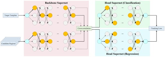 where denotes the backbone network search space, and presents the parameters of the backbone supernet . The pretrained weight of pretraining is shared among different subnet architectures and serves as the basis for the subsequent distributed search for the entire tracking network architecture. It is noteworthy that the pretraining procedure is performed only on the backbone supernet , not on the subnets , significantly reducing the training cost.