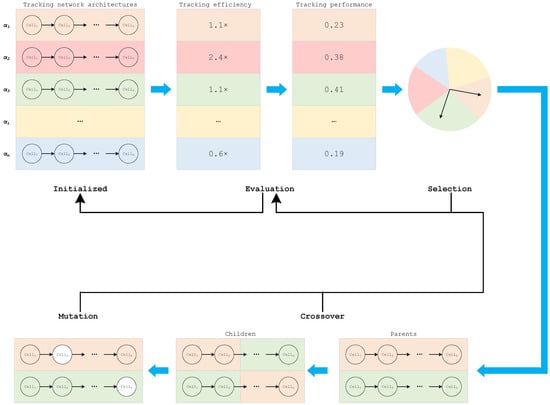 For the trained tracking network architecture, the search optimization is performed using the evolutionary algorithm, which adopts the single-path one-shot search method. That is, only a single subnet is sampled at a time, the basic cells in different paths are reorganized and mutated via the evolutionary algorithm, and finally, only the optimal path is retained. The iteration repeats until the set conditions are satisfied. Considering the limited computational power of real-world resource-constrained devices, the constraints of the network architecture complexity are set as