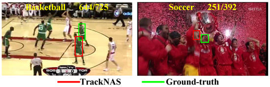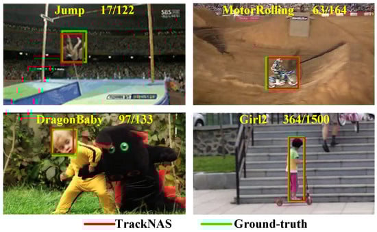 According to the description in Section 3.2, the proposed TrackNAS was obtained by performing a total of five searching processes of the network architecture. The input sizes of the target template and candidate region are set to and pixels, respectively. We start by pretraining the backbone supernet on ImageNet [64] for 300 epochs using the stochastic gradient descent (SGD) optimizer with a momentum of 0.9 and a weight decay of . The initial learning rate is set at 0.5, and linear annealing is applied. Then, we search the backbone and head network architectures for 120 epochs on the same dataset using the same settings as before. Next, we optimize the tracking network architecture on tracking data, which includes YouTube-BB [73], ImageNet-DET [64], ImageNet-VID [64], and COCO [63] for 30 epochs. During the first 10 epochs, we freeze the parameters of the backbone network and set their learning rate to be smaller than the global learning rate in the remaining epochs. Later, we perform evolutionary training on the training split of GOT-10k [74] to make the searched tracking network architecture lightweight. Finally, we retrain the lightweight tracking network architecture on ImageNet for 300 epochs using the MSProp optimizer with a momentum of 0.9 and a decay of 0.9. The weight decay is set at , the dropout ratio is 0.2, and the initial learning rate is 0.065. A warm-up is employed in the first 3 epochs, followed by cosine annealing, AutoAugment policy, and exponential moving average for training. Our tracker was implemented using Python 3.7 with PyTorch 1.8.2. All experiments were performed on an instance with an Intel Xeon (Santa Clara, CA, USA) Gold 6148v4 CPU @ 2.2 GHz CPU with 256 GB RAM and 4 NVIDIA Tesla (Austin, TX, USA) V100-SXM2 GPU with 64 GB VRAM. Our TrackNAS can run in real time at more than 150 FPS.