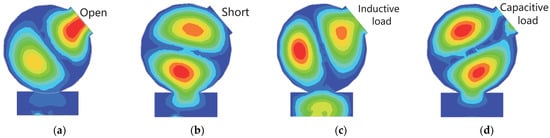 Electric field distribution under different reactance conditions with non-coaxial output: (a) open, (b) short, (c) inductive load, and (d) capacitive load. In the image, the red color represents the strongest electric field region, while the deep blue color represents the weakest electric field region.