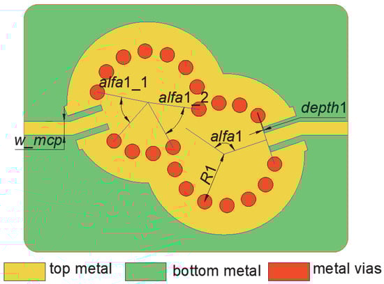 First, the excitation of individual cavity modes was studied. To better explain the design parameter, the configuration of the dual-mode filter with two cavities is illustrated in Figure 2. The whole filter is centrally symmetric. R1 represents the radius of circular cavity 1, which is the distance from the center of the cavity to the center of the ground vias. alfa1 denotes the angle between the centerline of the input port of circular cavity 1 and the centerline of the coupling port of cavity 1 and cavity 2. The vertex of the angle is the center of cavity 1, and the same vertex applies subsequently. alfa1_1 corresponds to the aperture size of the input port of cavity 1, which is the angle formed by the via centers of the two nearest grounded vias to the port and the center of cavity 1. These two ground vias are symmetrically distributed with the input port center line as the axis. alfa1_2 represents the aperture size of the coupling port of cavity 1 (coupling port of cavity 1 and cavity 2), which is the angle formed by the centers of the two nearest points to the coupling port and the center of the cavity. depth1 indicates the length to which the input coplanar waveguide (CPW) extends into the interior of the cavity. A positive value of depth1 indicates an inward extension into the cavity, while a negative value indicates the opposite direction. When the end of the slot coincides with the connecting line between the centers of the adjacent two grounded vias, it indicates that depth1 is 0 mm. W_mcp refers to the width of the microstrip line guided out, which corresponds to the width of the 50-ohm microstrip line in this design. Figure 3 shows the response of the dual modes of a single cavity under weak coupling conditions with varying alpha1. Weak coupling excitation was primarily intended to eliminate the influence of other factors, such as external coupling. It is evident that when the input and output are not co-axially symmetrically distributed, the coupling between degenerate modes increases with the increase in the input-output angle alpha1. When the relative bandwidth is below 6%, the alpha range can be selected between 110° to 130° based on the simulation results. From the field distribution plots of the low-frequency pole and high-frequency pole in Figure 4, it is evident that the two modes are orthogonal degenerate modes. Furthermore, a transmission zero point can be observed in the vicinity of the upper sideband, labeled as Z1. This creates a steep transition band, which is a characteristic feature of dual-mode filters. From the field distribution plot of the transmission zero point in Figure 5a, it can be seen that this field is a spatially stable single-mode field, with the output port located exactly at the wave node. Hence, it does not excite another mode from port 2. From a frequency perspective, this frequency point coincides with the resonance frequency of the cavity’s first higher-order mode, TM110. Moreover, it can be observed from the subsequent study that the frequency of the transmission zero point is independent of the external coupling strength and the opening size of the coupling gap between the cavities, as shown in Figure 5. Additionally, the impact of alpha1 on out-of-band suppression can be observed from Figure 5b. The second transmission zero point Z2 appears, and its position on the frequency axis increases with alpha1. The appearance of this pole was analyzed in the previous chapter. The frequency of this point coincides precisely with the position of the wave node, making the output energy zero. The position of this frequency point is solely determined by the angle alpha1 between the excitation end and the coupling end, irrespective of other parameters. The field distribution is shown in Figure 5b. By adjusting the position of Z2, the out-of-band suppression of the upper sideband can be significantly improved. If Z2 is located close to the passband, it improves the out-of-band suppression near the passband, making it suitable for filter designs requiring high near-end suppression. It is also possible to adjust Z2 to suppress the TM020 parasitic resonance closest to the TM010 mode, thereby achieving good out-of-band suppression at the far end of the high-frequency sideband. However, the trade-off for doing so is that the near-end suppression is relatively poor.