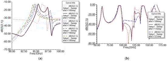 The effect of alfa1 on S−parameters. (a) Effect within the passband under weak coupling excitation. (b) Effect on out-of-band suppression.