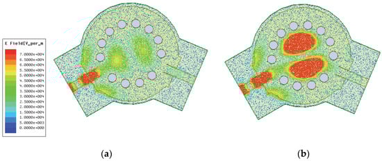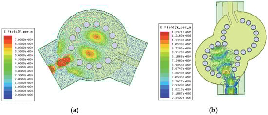 The surface integrals are over entire effecting surface regions. There is energy transmission at the coupling gap, satisfying Equation (2), which can be treated as an equivalent lossy surface. Therefore, even if an ideal conductor is used in the actual fabrication, the coupling condition can still be met. This makes it possible to adjust the coupling gap to excite dual-mode modes. An analysis was conducted on a cavity with two coupling gaps, with coupling gap 1 serving as the input end, fed by a waveguide, and coupling gap 2 simulated as an impedance boundary to mimic actual loading conditions, as shown in Figure 1. From the simulation results, it can be concluded that when the input and output ends are co-axially arranged, it is impossible to achieve energy coupling between degenerate modes. When the input and output ends are not co-axially arranged, dual-mode excitation is related to the boundary conditions at the coupling gap. When the boundary condition at the coupling gap is purely reactive or open or short-circuited, the coupling gap experiences total reflection with no energy loss, so dual-mode excitation is not possible. From the perspective of field distribution, the electric field distribution in space is stable over time, forming a single-mode field with only amplitude variation, as shown in Figure 1. When the boundary condition at the coupling gap is set to a maximum impedance value, impedance-matched, or short-circuited, the electric field distribution near the boundary is strongest, and it approaches zero for short-circuited conditions. Capacitive and inductive boundary conditions also have different characteristics. When the boundary condition at the coupling gap is set to an appropriate impedance, dual-mode excitation can be achieved. From the perspective of field distribution, the dynamic effect of the electric field is rotational around the center over time, which indicates the superposition of two different field distributions. It can be regarded as the result of the superposition of the field excited by port 1 and the field excited by port 2. Thus, the conditions for exciting dual-mode modes are non-coaxial input and output and appropriate boundary impedance, both of which are essential. As the cavity has a selection function, the actual mode coupling situation also depends on the resonance frequency.