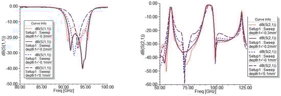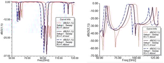 For the design of in-band poles, the coupling between dual-mode cavities is complex, making it challenging to calculate precise coupling coefficient parameters. Therefore, a parameter sweeping method can be considered to observe the variation in each parameter’s impact on the in-band poles and thereby improve the effectiveness of the final design. From Figure 6, it can be observed that R1 primarily influences the resonator’s frequency and has almost no effect on the coupling strength. It only slightly affects the relative positions of the in-band poles. When R1 changes, the entire passband and stopband undergo vertical shifts, and the resonant frequency fnm can be calculated using Equation (3) [29]