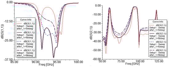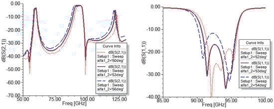 The strength of external coupling is mainly controlled by the aperture angle alpha1_1 at the input end, as shown in Figure 7. When alpha1_1 is small, the positions of the poles are relatively far apart, resulting in poor standing wave levels. As alpha1_1 increases, the pole positions approach each other, leading to improved in-band standing wave performance. However, the rectangular coefficient and out-of-band suppressions slightly deteriorate. When alpha1_1 is at an appropriate level, the standing wave levels are better. Afterward, further increasing alpha1_1 brings the pole positions even closer, and excessive external coupling may cause pole merging, leading to deteriorated standing wave levels. As alpha1_1 increases, the resonant frequency decreases, causing the overall passband to shift downwards. From the perspective of out-of-band suppression, with the increase in alpha1_1, the external coupling becomes stronger, leading to a worse rectangular coefficient and out-of-band suppression.