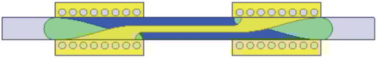 Notably, some pioneering works, such as those referenced in [1,2,3], have successfully leveraged 3D print technology to create W-band filters with low-loss characteristics. Additionally, Ref. [4] demonstrated the use of laser micro-machine processing, achieving promising results in terms of low loss. However, one notable limitation of these early designs lies in their 3D structure, posing challenges when attempting to integrate them with planar circuits and chips [5,6,7,8,9,10,11].