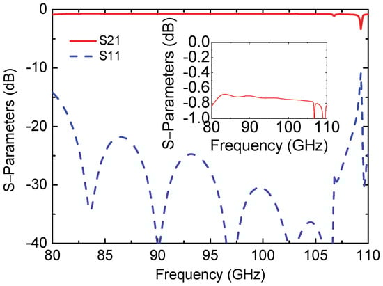 Due to the test instrument’s port being a WR-10 waveguide, we designed a finline waveguide-to-microstrip transition structure with its length L3 = 5 mm. Figure 10 illustrates a back-to-back finline waveguide-to-microstrip transition structure. Simulation results, as shown in Figure 11, indicate that this structure can cover a frequency range of approximately 80–110 GHz. The simulated insertion loss at 93 GHz is 0.75 dB. However, actual measurements usually show higher losses than simulated results, so the measured insertion loss for the back-to-back transition structure is expected to be greater than 0.75 dB. Ref. [18] tested a similar back-to-back transition structure in the W-band below 85 GHz and found measured insertion losses ranging from 0.94 to 1.4 dB in the frequency range of 75–85 GHz. Therefore, we conservatively estimate an insertion loss of 0.94 dB for the back-to-back transition structure in the following analysis.