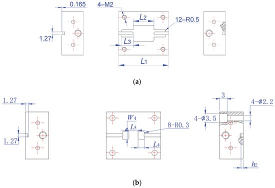 Waveguide cavity processing diagrams are used to load the structure shown in Figure 12. (a) The lower half of the cavity. (b) The upper half of the cavity. L1 = 22 mm, L2 = 9.07 mm, L3 = 5.2 mm, W4 = 2.92 mm, L4 = 2.66 mm, and h2 = 0.9 mm. The dimensional tolerance for the WR-10 waveguide fabrication is less than or equal to ±0.005 mm.