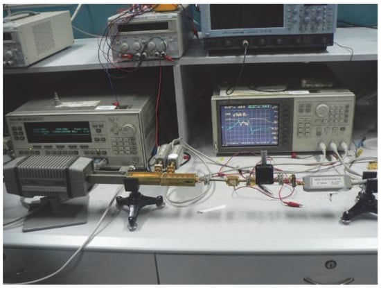 It is worth noting that the air cavity reserved above the microstrip line and coplanar waveguide will produce parasitic resonances. As the filter operates at high frequencies, these parasitic frequencies are likely to fall within the filter’s passband. To address this issue, we separate the air cavity into two smaller ones, each with dimensions W4 × L4 × h2. After verification, when W4 = 2.92 mm, L4 = 2.66 mm, and h2 = 0.9 mm, our design requirements are met. Figure 14 shows a picture of the cavity loaded with the proposed filter and transitions. We conducted the testing using a network analyzer in the test setup shown in Figure 15. The measured results after de-embedding the transition structures are compared to the simulated results of the proposed filter in Figure 16.