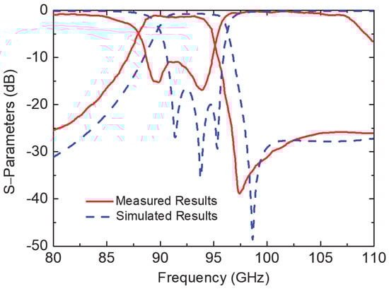 The proposed filter exhibited an impressive low insertion loss of under 2.06 dB from 88.8 GHz to 94 GHz, with a specific value of 1.36 dB at 92 GHz, after accounting for the de-embedding of transition structures. Notably, we successfully introduced a high-frequency out-of-band transmission zero to enhance steep roll-off characteristics in the high-frequency out-of-band region. Comparison with recent publications showcased our designed W-band filter’s remarkable attributes, including low losses and compact dimensions, all while maintaining considerable manufacturing cost advantages. By contributing to the ongoing advancements in the field of W-band filters, our research offers a perspective on achieving practical and efficient filtering solutions for modern millimeter-wave communication and radar systems.