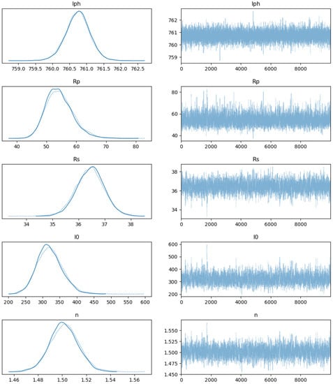 Figure 4 shows the density distributions and the trace plots for each equivalent circuit parameter obtained under these conditions for the OPV (PTB7-Th:C70, annealed at 175 °C) experimental data shown in the literature [40]. The results for each parameter estimate are summarized in Table 2. Similarly, the calculation converges well, and no serious discrepancy is observed between the simulated curve using the average values of the density distributions and the experimental data, as shown in Figure 5. On the other hand, the mean values of each parameter shown in Table 2 are slightly different from those shown in the previous work [29]. This is due to the fact that the experimental data up to +0.8 V were used in this study, while those up to +0.9 V were used in the previous work.