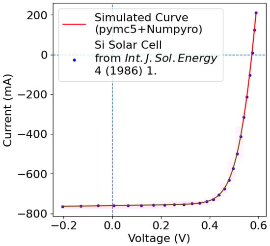 As a result of a large number of trials, the author recommends the following calculation conditions: use calculation package Numpyro under PyMC ver. 5 with 10,000 steps for both sampling and burn-in. Figure 2 shows the density distributions, which are similar to those of the posterior probability density function, and the trace plots for each equivalent circuit parameter obtained under these conditions for the tabular experimental data of the commercial Si solar cell (R.T.C. France) presented in the literature [18]. Table 1 shows the results for the estimated values. The shapes of density distributions generated by two independent chains mimic each other and are similar to normal distribution functions. According to the central limit theorem, the density distribution generally approaches a normal distribution function as the number of sampling steps increases. The trace plots show that the values are repeatedly updated within an appropriate range, indicating that the Markov chain Monte Carlo calculation converges well. In fact, the (R-hat) value, which indicates the convergence of this calculation, is 1.0 for all parameters. The deviation of from 1.0 is usually accompanied by trace plots drifting unsteadily over a wide range and skewed density distributions. The average values for each parameter listed in Table 1 are practically the same as those in the literature. In addition, as shown in Figure 3, the current–voltage curve calculated using the mean values of the density distributions reasonably reproduces the experimental data.