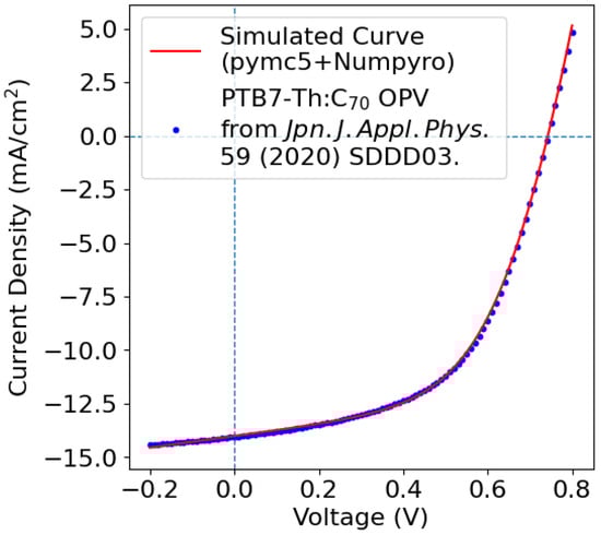 Experimental data (symbols) and simulated curve (line) for the OPV (PTB7-Th:C70, annealed at 175 °C) [40].