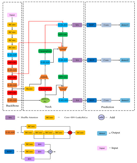 In Figure 1, the input image is resized to a uniform size of 640 × 640 pixels to meet the format requirements of the entire network. The resized images are then fed into the backbone network, where the BConv convolutional layer extracts image features at different scales. The MP-OD convolutional layer adopts a parallel strategy to learn the four-dimensional complementary attention of the input channel, output channel, kernel space, and number of kernels without disrupting the original gradient path. This process quickly locates effective features in the model feature map and improves its feature extraction ability. The neck part uses an improved weighted bidirectional feature pyramid, BiFPN-P3. The red line represents our improvement on the original PAFPN. We use the P3 layer, which is the top layer of the neck E-ELEAN module and the MPConv module. The node is deleted, and the root node and end node of the P3 and P4 layers are connected simultaneously. Through a top-down and bottom-up model structure, semantic information of different scales is transferred from shallow to deep layers, outputting three-layer fusion feature maps of different scales. The SA mechanism redistributes the weights in the fused feature map to suppress irrelevant features while enhancing contraband features for more robust representations. Finally, four detection layers at the prediction end predict the confidence, category, and anchor box of the result to obtain the final detection outcome.