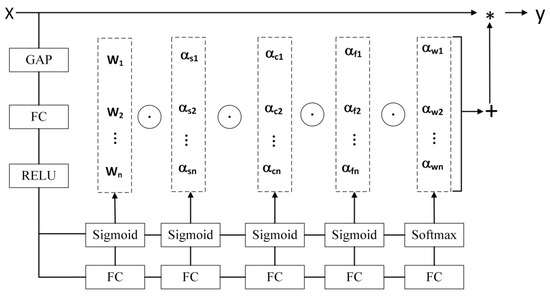 In the equation, represents the final weight obtained by multiplication in each of the four dimensions of the dynamic convolution kernel. The input feature vector X is length-unified by GAP.